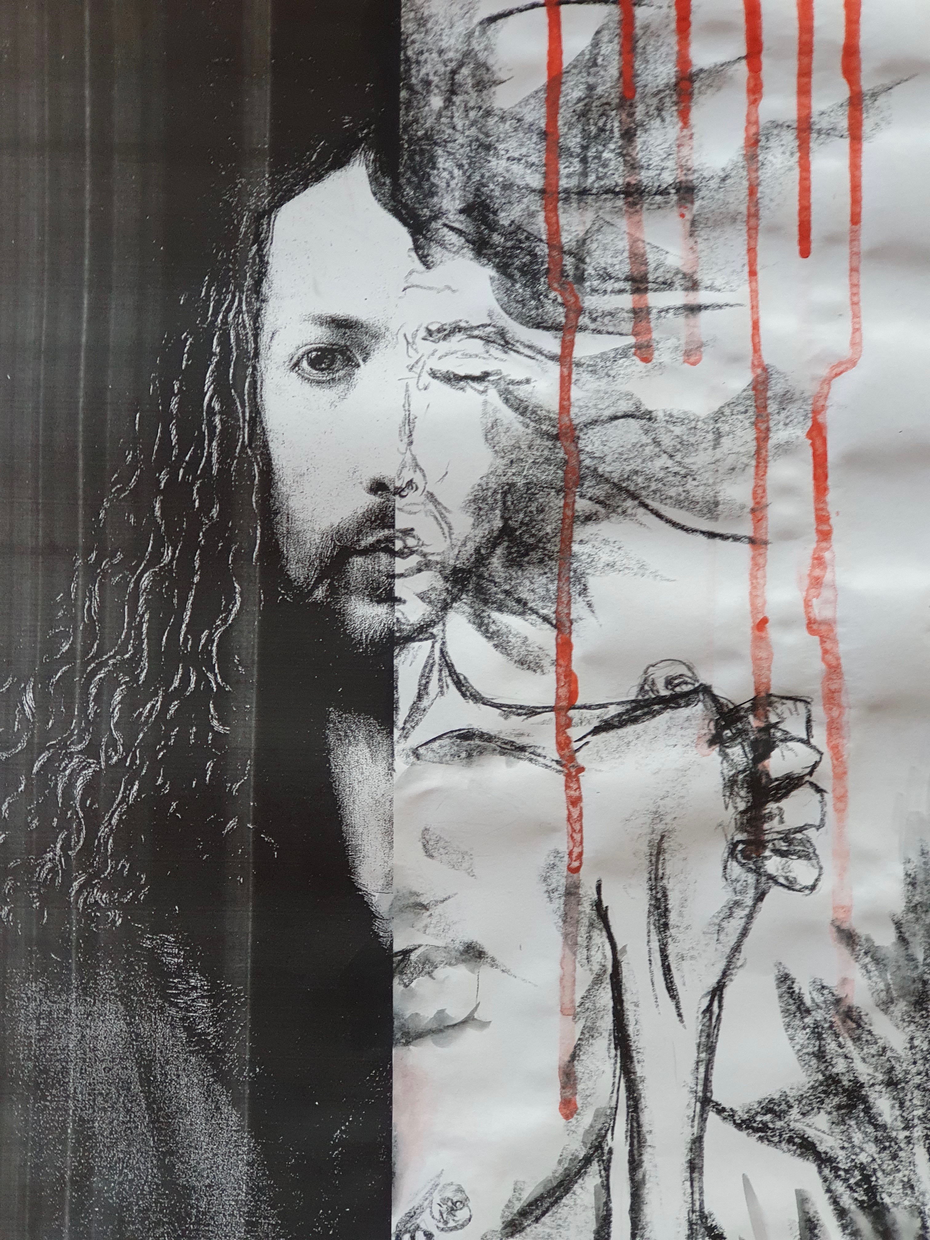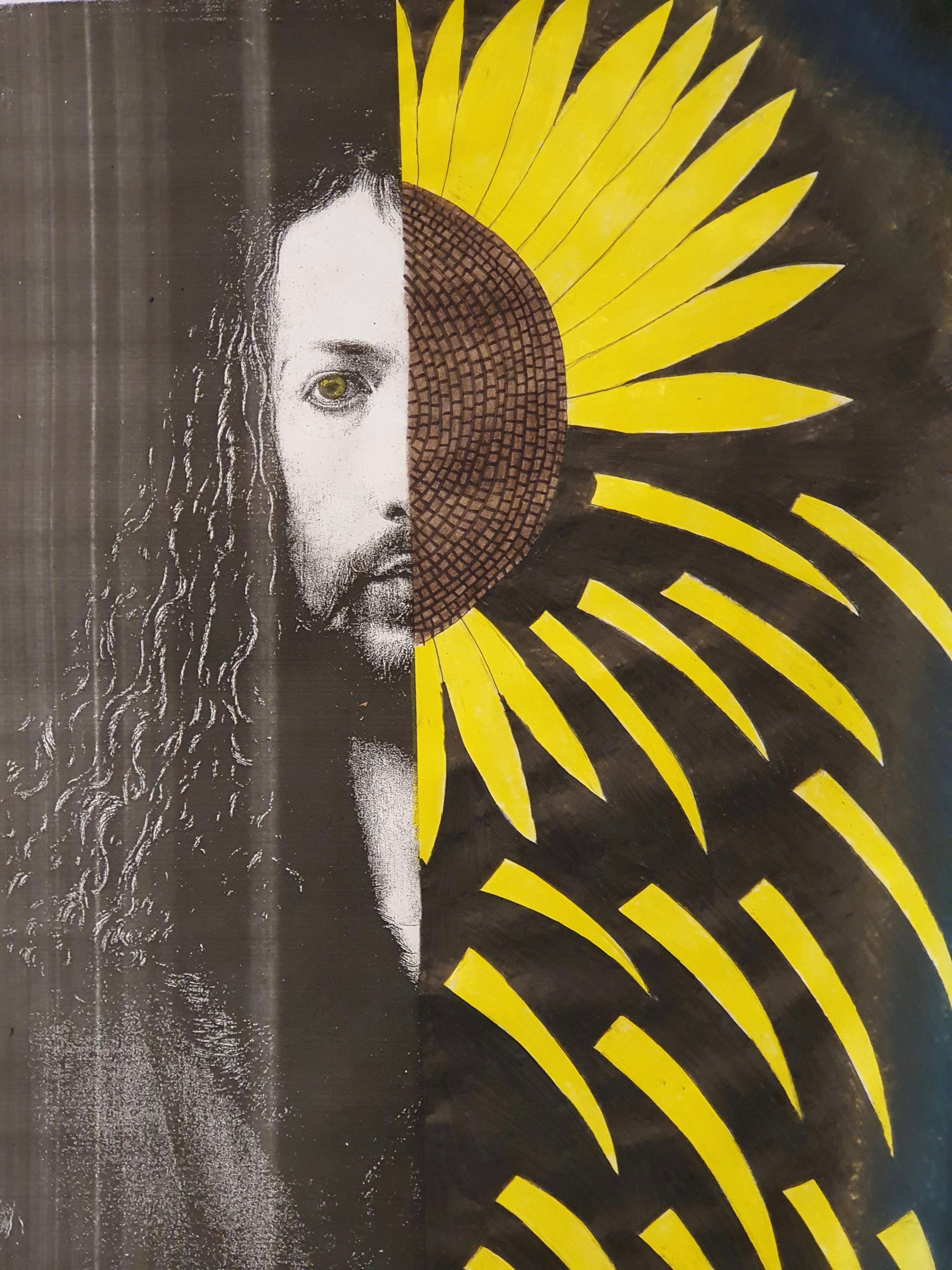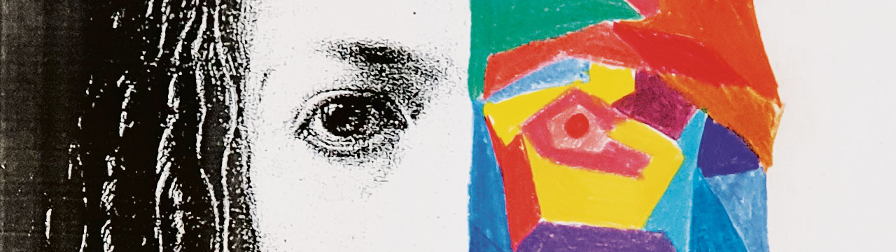 Ausgangspunkt meines Kunstworkshops war eine zerschnittene Kopie des berühmten Selbstporträts von Albrecht Dürer aus der Alten Pinakothek. Die rechte Hälfte des Gesichtes war leer und die Patientinnen sollten diese Leerstelle ergänzen.