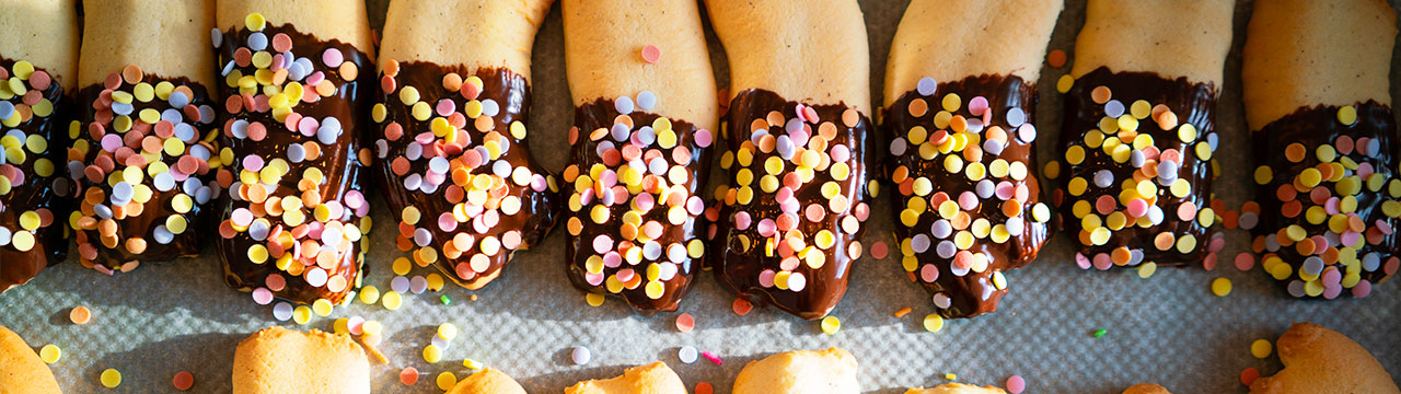 - Kuvertüren getrennt im Wasserbad auflösen, das Spritzgebäck darin zum Teil eintauchen und nach Belieben dekorieren